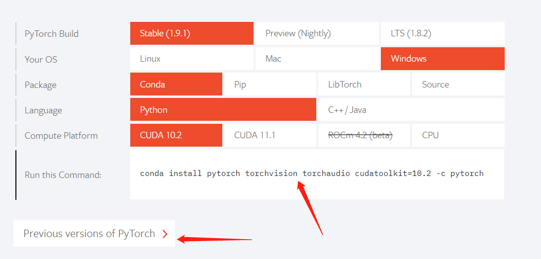 然后进入pytorch官网 向下滑到这里复制这串代码 按回车 就可以自动安装了(如果这个推荐的版本不合适可以进入下面那个箭头指的地方找别的版本)