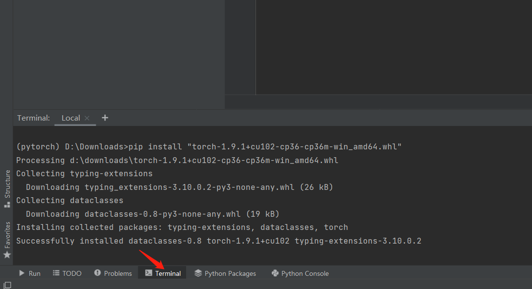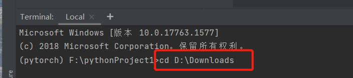 然后回报错,接下来点击Terminal,输入cd +刚才下载的pytorch所在目录,