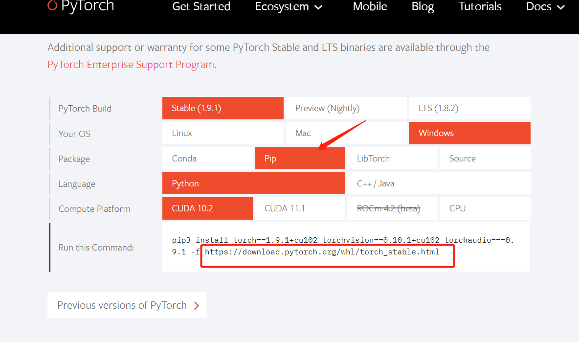 去官网下载pytorch,这次选择pip,然后复制红色框里的链接