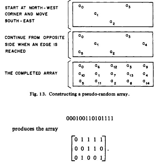 比如周期为3^9 -1=19682的序列可以折叠为26x757=19682的二维伪随机序列。M-ARRAY
