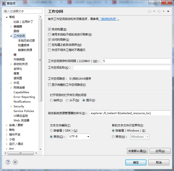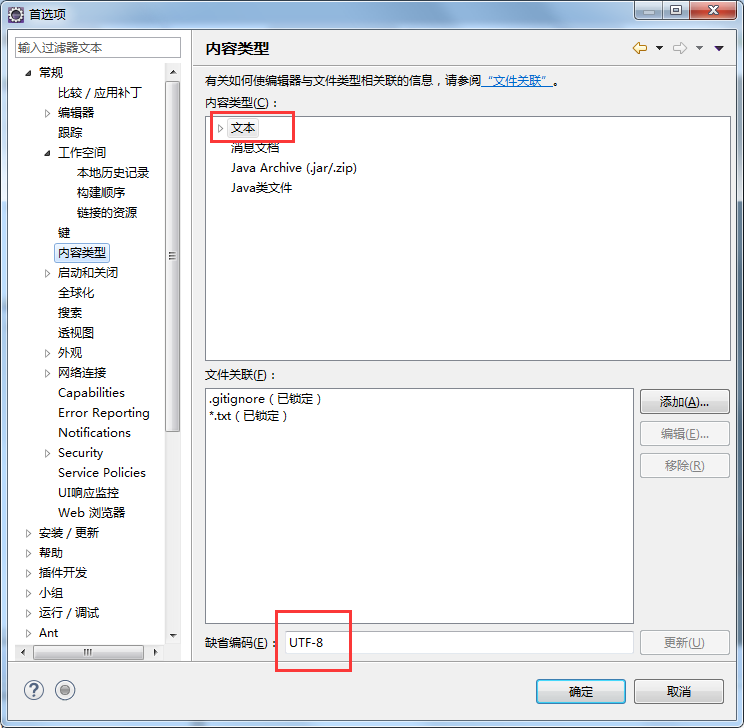 窗口-首选项-常规-内容类型-缺省编码-:UTF-8