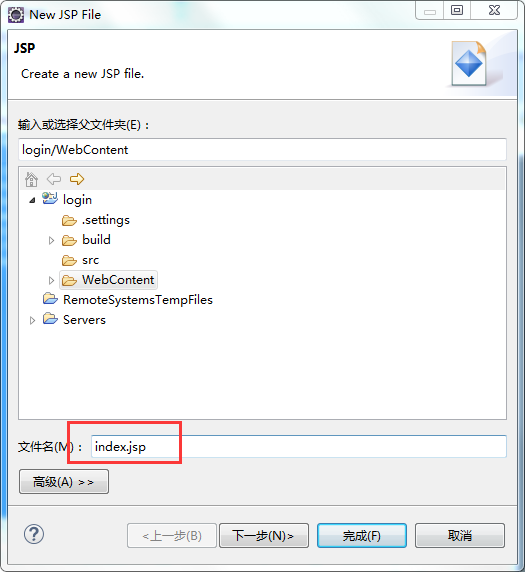 然后点击完成就可以创建成功了,接着编辑这个jsp文件,输入一下代码