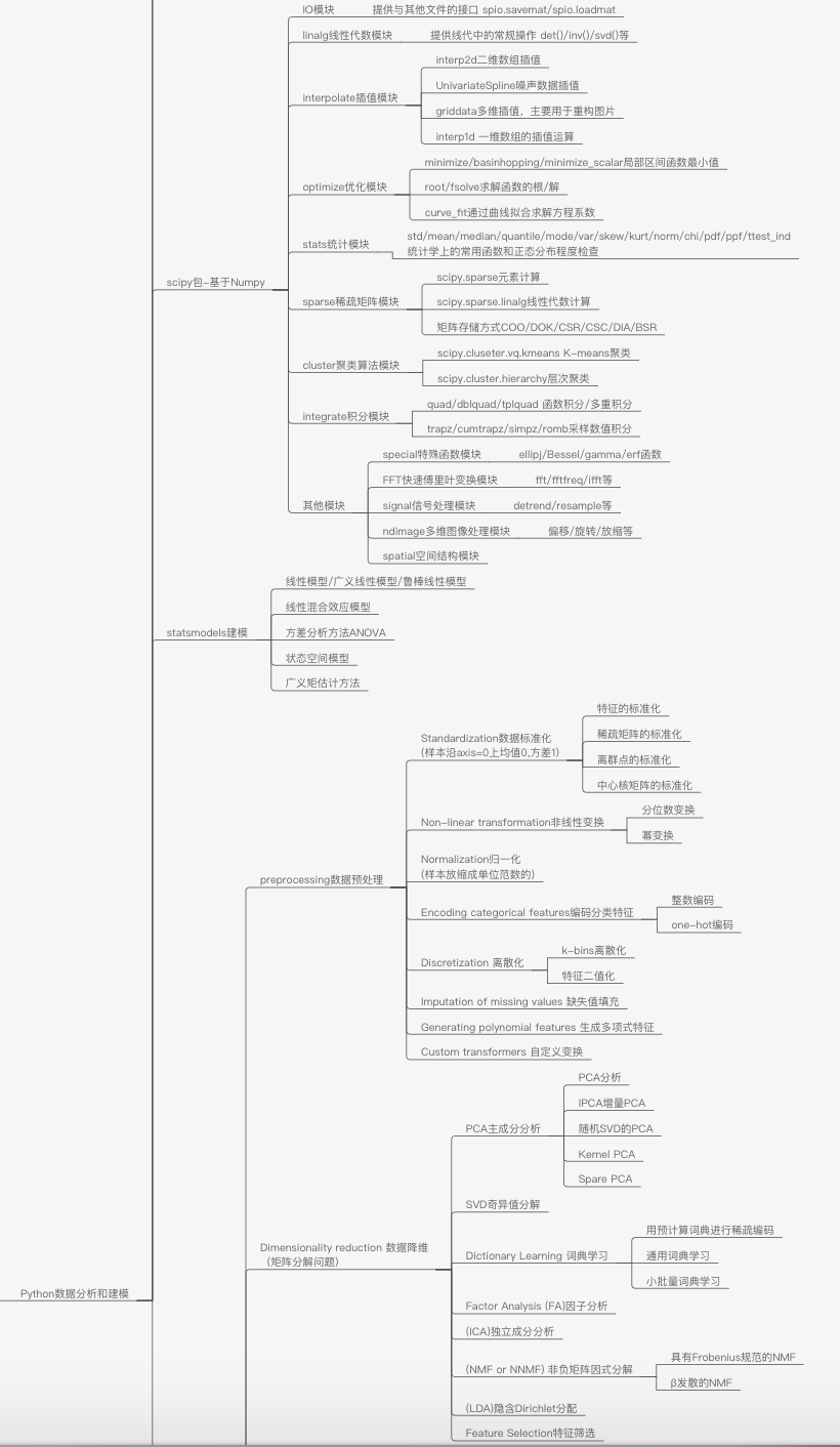 建议:scipy学习可以先读博客https://blog.csdn.net/gengkui9897/article/details/83111138,有主要方法介绍和代码实现,然后再去看上述推荐的scipy笔记补充。sklearn学习建议直接读上面的官方文档,写的很结构化很直观。