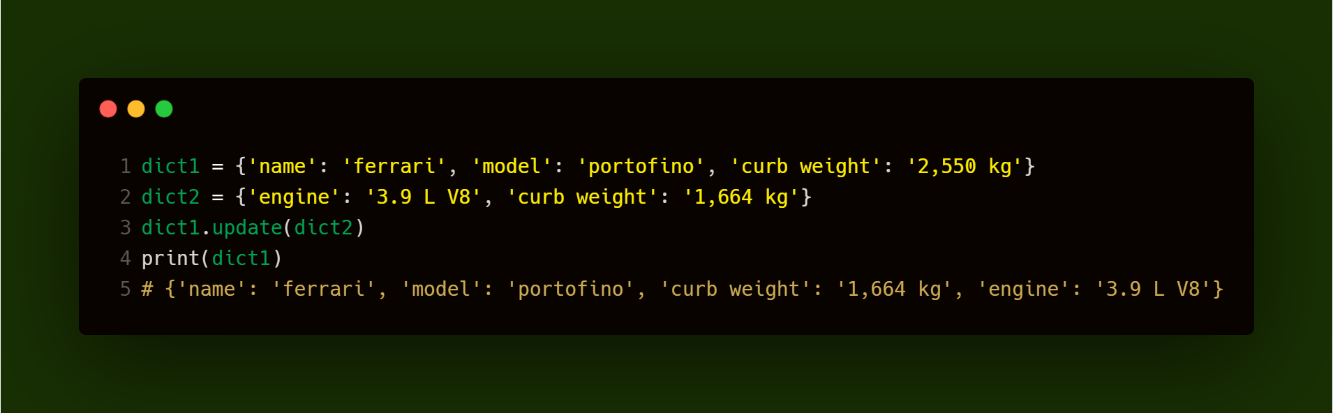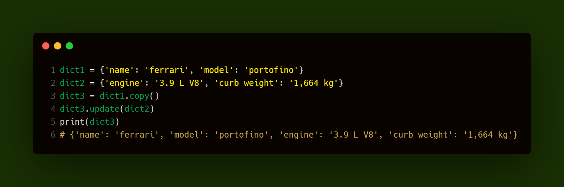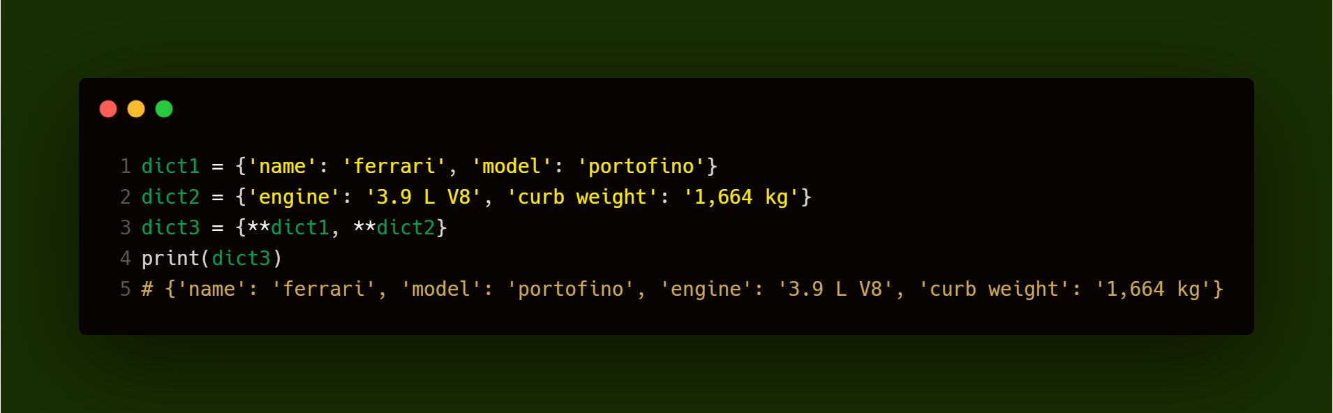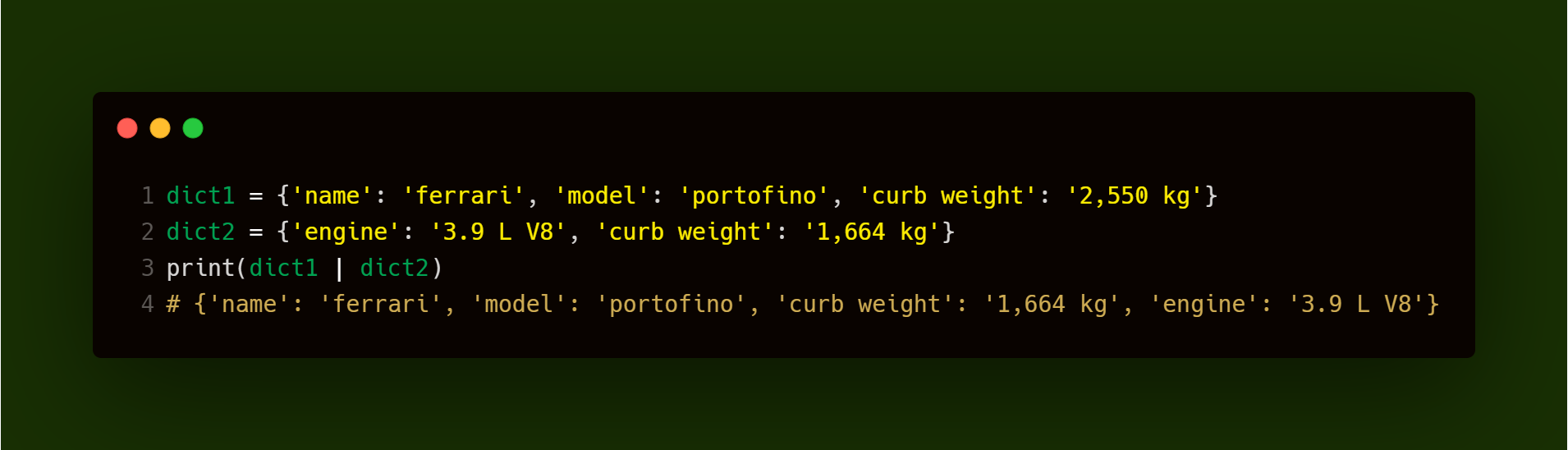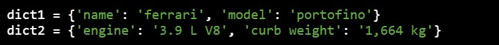 现在我们想合并这两个字典,因为它们包含关于同一辆车的信息。在python3.8及更早版本中,要合并两个字典,我们可以使用