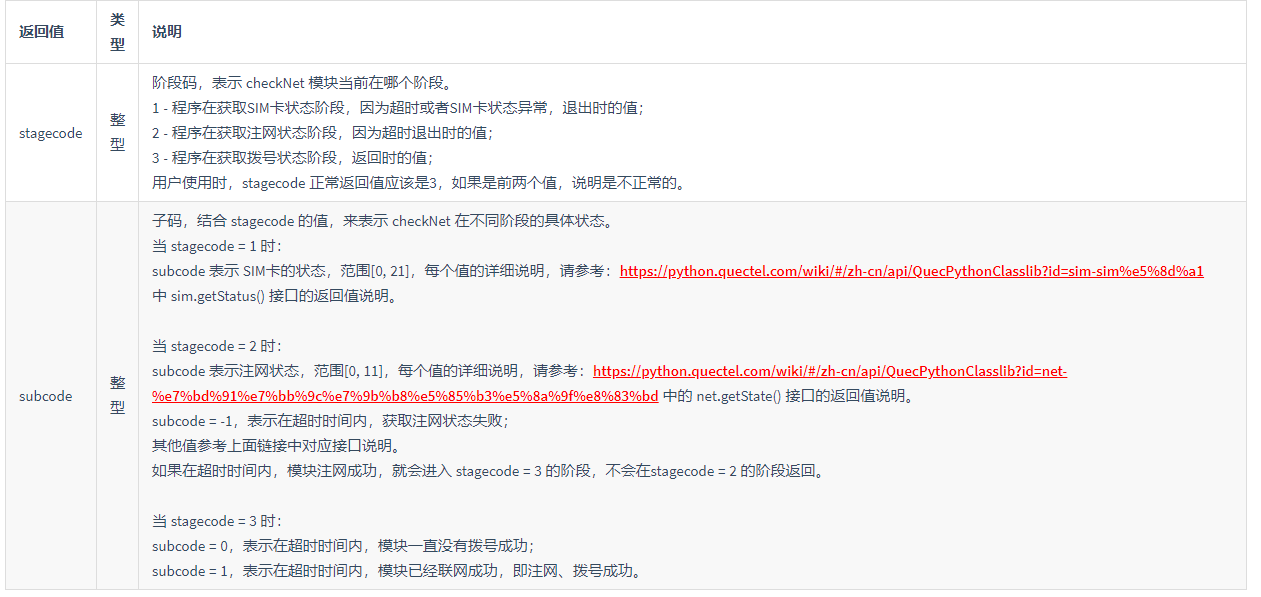 以上就是懦弱秀发最近收集整理的关于移远QuecPython(基于EC600s)开发物联网应用(七) QuecPython通讯相关模块一. sim --SIM卡模块二. dataCall - 数据拨号三. net - 网络相关功能四. checkNet - 等待网络就绪五. cellLocator - 基站定位的全部内容,更多相关移远QuecPython(基于EC600s)开发物联网应用(七)内容请搜索靠谱客的其他文章。