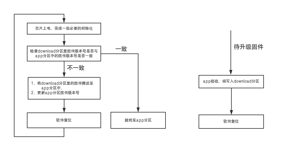 | boot下载 | download分区在片外或片内flash | 1、断网或中断不会死机 | 1、固件下载功能不能被升级 2、需要较大内存 |