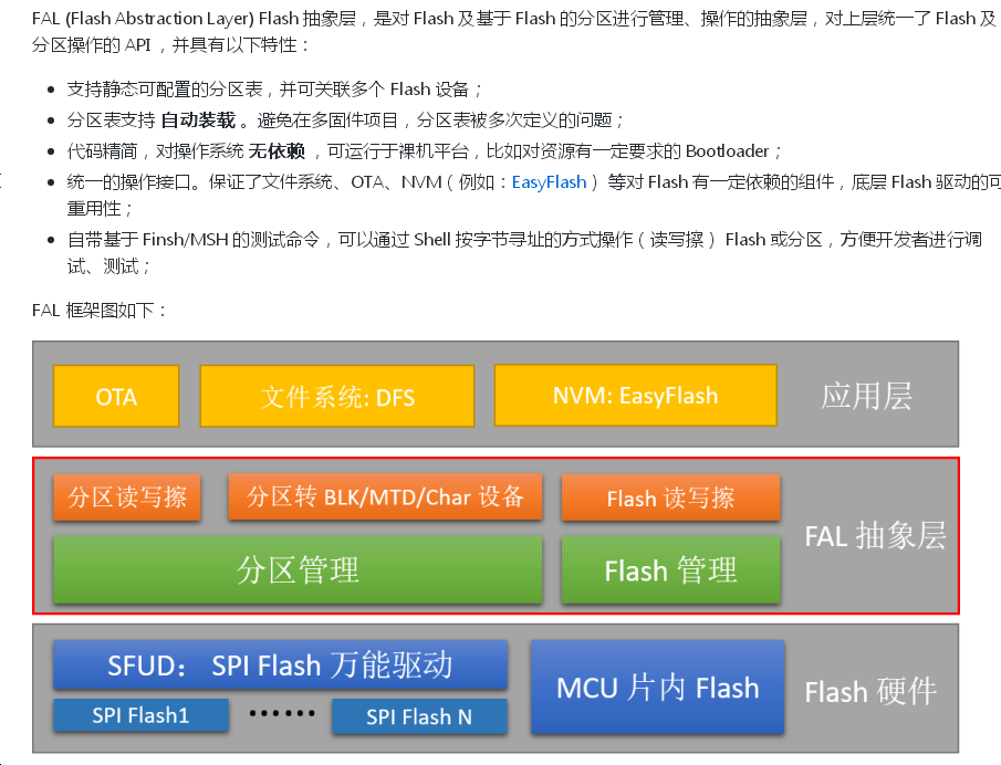 FAL:(Flash Abstraction Layer) Flash 抽象层,是对 Flash 及基于 Flash 的分区进行管理、操作的抽象层,对上层统一了 Flash 及 分区操作的 API