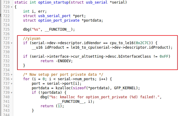 1:/driver/usb/serial/option.c更改了4个位置,并没 有严格按照ec200s的指导文档来(2.6.30以上、3.0以上内核还会涉及wwan、qcserial相关文件,看相关文档)