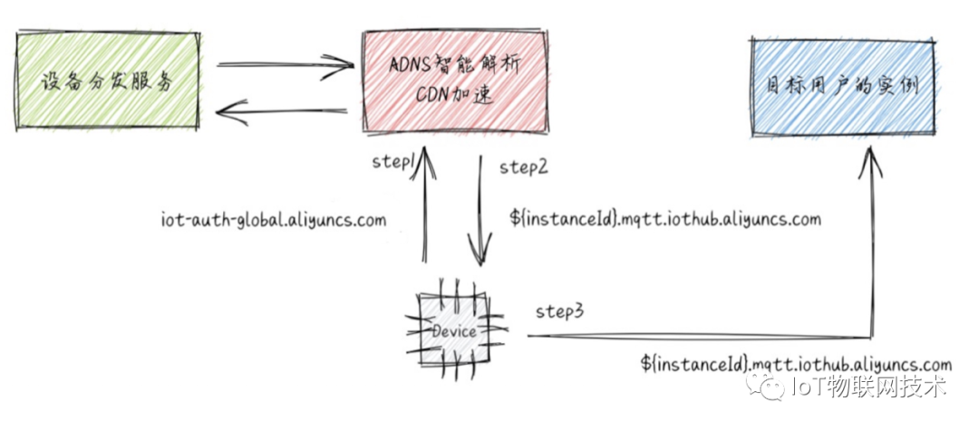 阿里云物联网平台提出了设备分发的概念:物联网平台通过设备分发实现设备跨地域、跨实例或跨账号的分发。