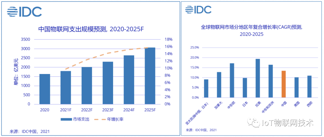 近年来,物联网技术正以指数级的速度日渐成熟,并潜移默化的改变着人们的生活。根据国际数据公司IDC的预测估计,到2025年,将有416亿台联网的IoT设备或“物”,生成79.4 ZB的数据。同时IDC中国研究数据显示,2020年全球物联网支出达到6904.7亿美元,其中中国市场占比23.6%。IDC预测,到2025年全球物联网市场将达到1.1万亿美元,年均复合增长11.4%,其中中国市场占比将提升到25.9%,物联网市场规模全球第一。
