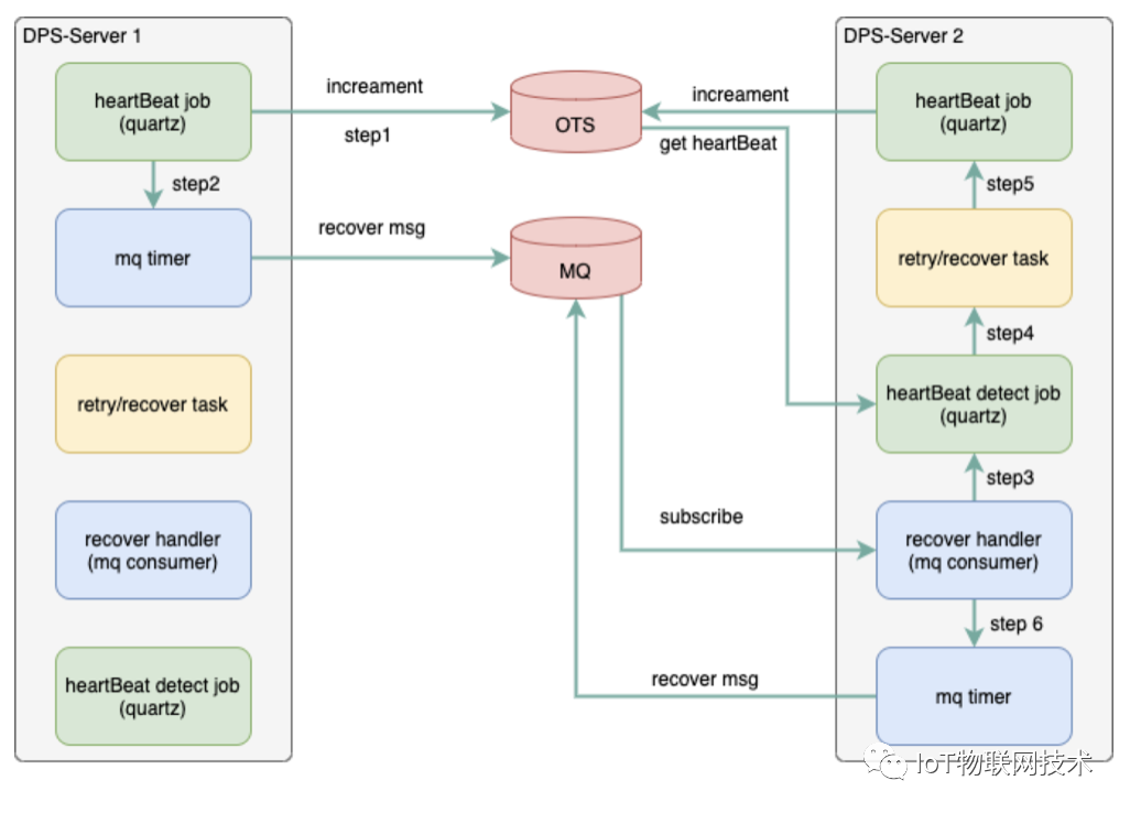 由于设备数据的分发操作都是采用长任务进行处理,所以为了防止服务器宕机或者重启导致的任务中断,系统内置了故障转移机制,来保证任务一定会走到状态机终态,其核心思路就是采用心跳包和单机定时检测(quartz)来实现服务器的故障转移。下图演示了server1接收请求并,如果出现故障,是如何转移到server2当中的。