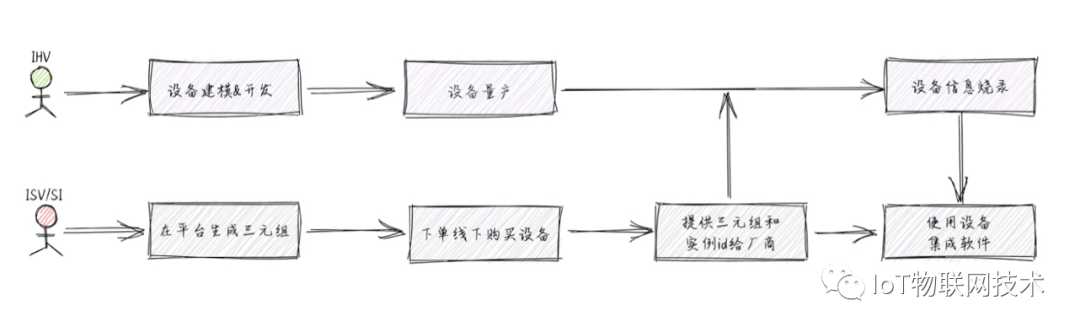 用户软硬分离,IHV需要将设备交付给SI/ISV管理:IHV对设备进行建模和开发,并线下量产设备;ISV/SI在阿里云物联网平台批量生成设备三元组信息;ISV/SI线下向IHV购买设备,同时把自己实例下创建的三元组信息和设备接入接入点信息提供给IHV;IHV用上一步骤的三元组和实例信息烧录设备,并交付设备给ISV/SI;ISV/SI集成软件并部署使用设备。当前的场景存在的问题: