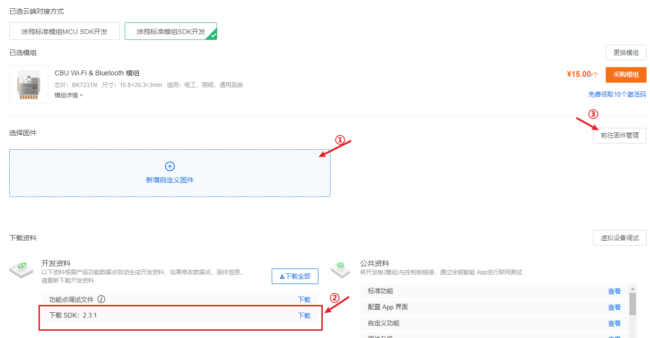 箭头②指向的“下载SDK:2.3.1”,可以下载该模组的2.3.1版本的SDK。