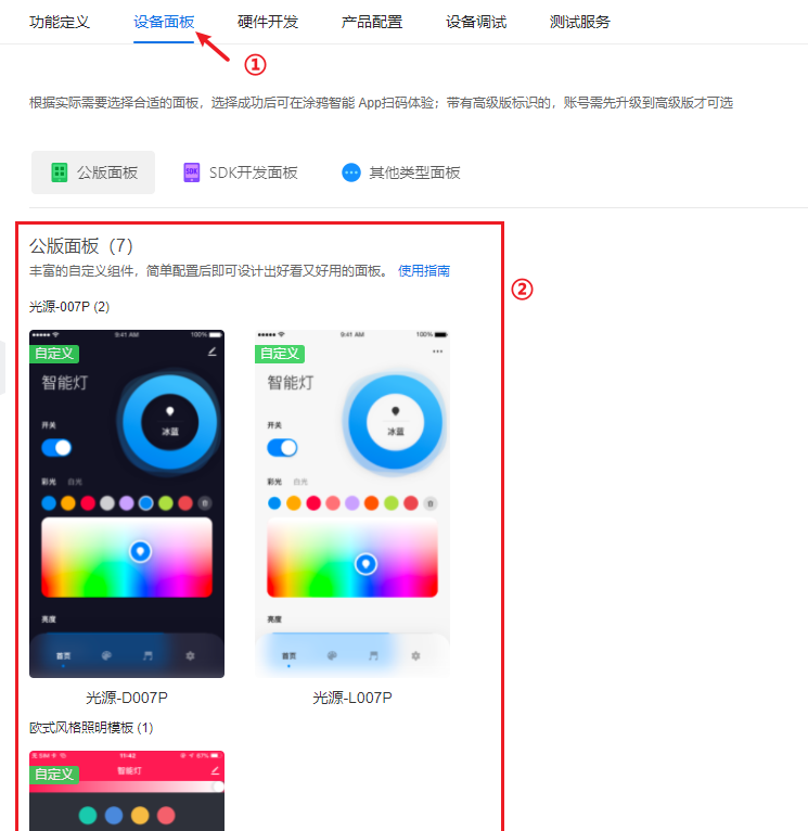 在产品创建完成,功能定义设置完成后,还需对面板进行设置。对于控制面板,你可以直接选择公版面板,也可以面板SDK自己开发新的面板,部分产品还支持可视化配置面板,只需在面板工作台上拖拖拽拽就可以完成面板的开发,所见即所得。