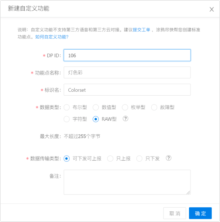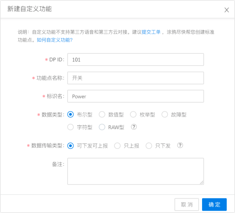- DP ID:功能点的编码,设备与云端的功能数据通过功能点 ID 进行传输。前100个DP ID涂鸦保留使用,自定义DP点从101开始。
