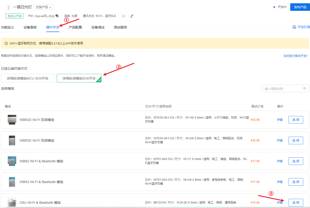 1.点击“硬件开发”,选择“涂鸦标准模组SDK开发”,选择“CBU Wi-Fi&Bluetooth 模组”(如果你使用的是其他模组,选择对应的模组即可)。