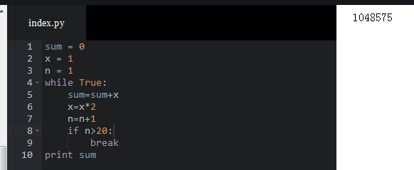 利用 while True 无限循环配合 break 语句,计算 1 + 2 + 4 + 8 + 16 + ... 的前20项的和。