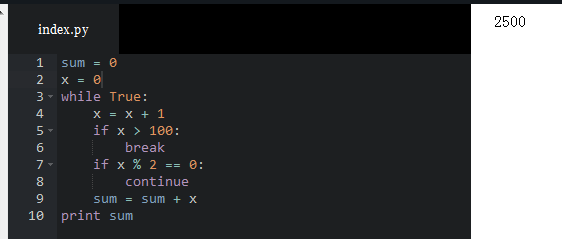 对已有的计算 0 - 100 的while循环进行改造,通过增加 continue 语句,使得只计算奇数的和: