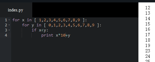 对100以内的两位数,请使用一个两重循环打印出所有十位数数字比个位数数字小的数,例如,23(2 < 3)。