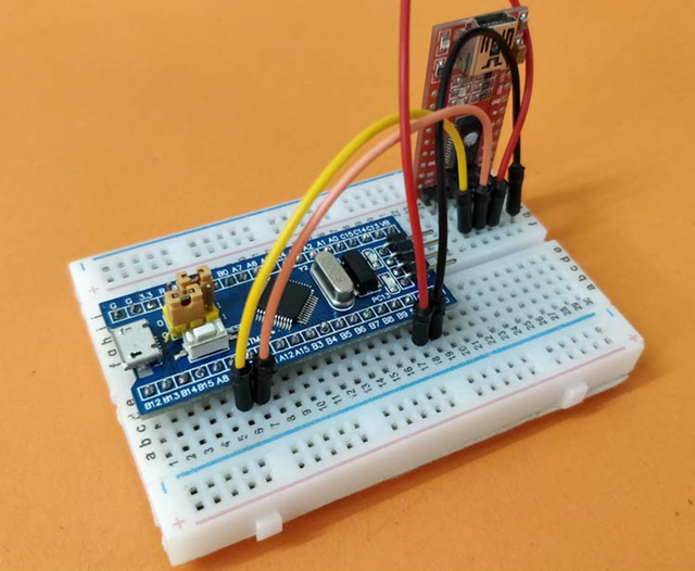 FTDI板的Vcc管脚连接到板子供电的STM32 5V管脚。地连接到STM32的地。FTDI板的Rx和Tx引脚分别连接到STM32的A9和A10引脚。其中 A9 是 STM32 MCU 的 Tx 引脚,A10 是 Rx 引脚。