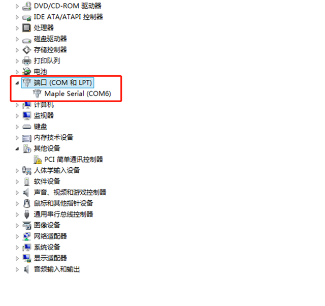 把开发板用USB线连上计算机,现在计算机应该能够发现开发板了。如果您看到正在安装任何其他驱动程序,请稍等片刻。然后进入 “设备管理器” 并检查是否发现了您的 STM32 板,如下所示。我的连接到 COM6,名称为 Maple。