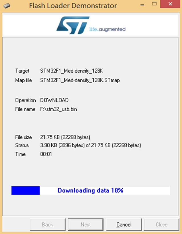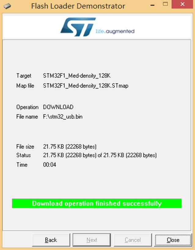 第 8 步: 烧写成功后,我们将看到以下屏幕。单击关闭并退出应用程序。接着我们准备 Arduino IDE 并安装驱动程序,然后才能使用USB烧录 STM32 板。