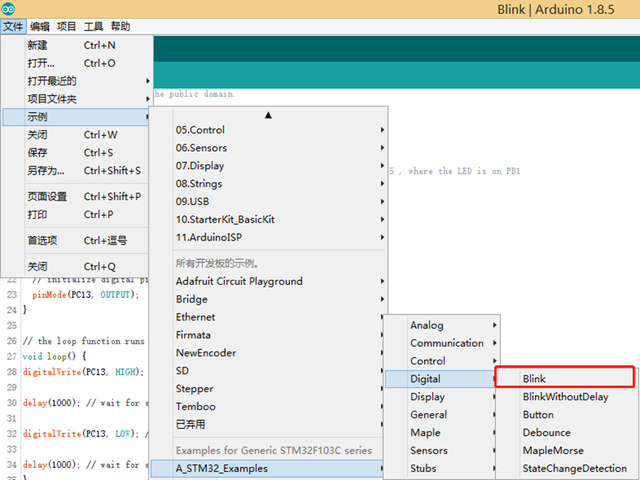 现在 Arduino IDE 已准备好对 STM32F103C8 开发板进行编程。让我们将示例闪烁程序从 Arduino IDE 上传到 STM32F103C8 板,测试是否正常。示例程序可以通过如下步骤找到