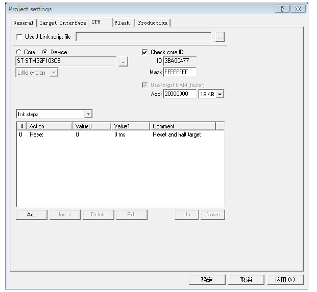 第一步:Option-->Project Settings-->CPU下选择 Device 在下拉菜单中找到自己的芯片型号后点击确定。