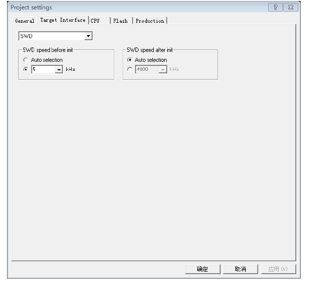 第二步:目标接口方式和速度设置:打开Target Interface选项,选择SWD方式,下边的SWD speed before init和SWD speed after init可以选择为Auto selection。