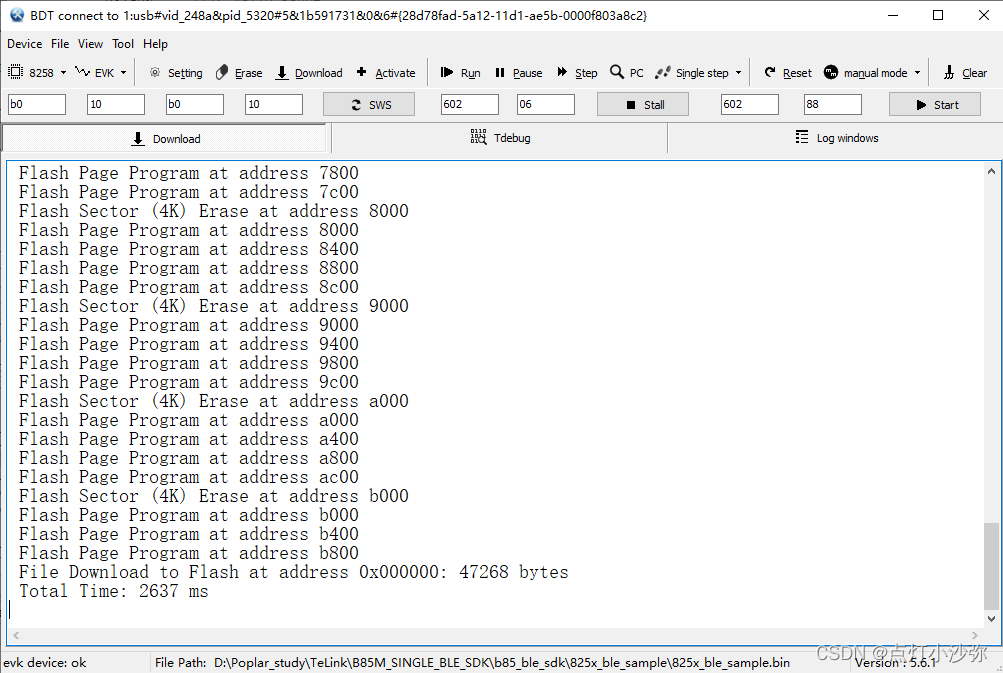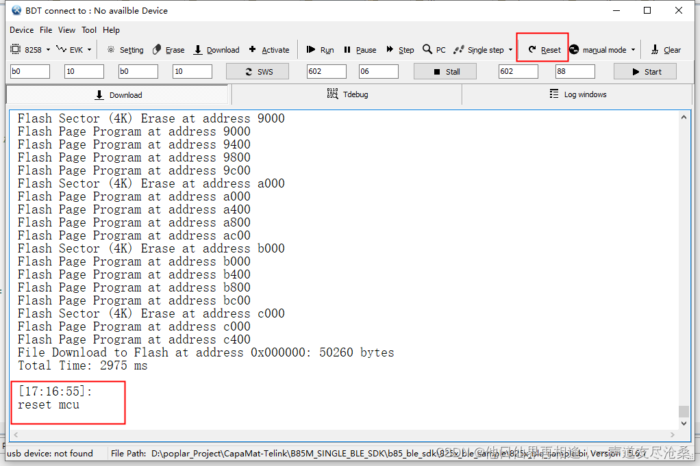 以上就是忧郁星月最近收集整理的关于Tlsr8258开发-程序烧写1.接线图2.烧写软件3.成功烧写显示4.点击“Reset”,程序就可以运行的全部内容,更多相关Tlsr8258开发-程序烧写1内容请搜索靠谱客的其他文章。