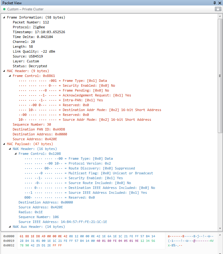 展开Packet View 可以看到数据中的所有解析数据,主要的MAC地址、网络短地址、PANID、端点号、Cluster ID、Profile ID等参数,APS Payload就是应用层发送的交互数据,这里自定义发送 12 34 56 78 90 。