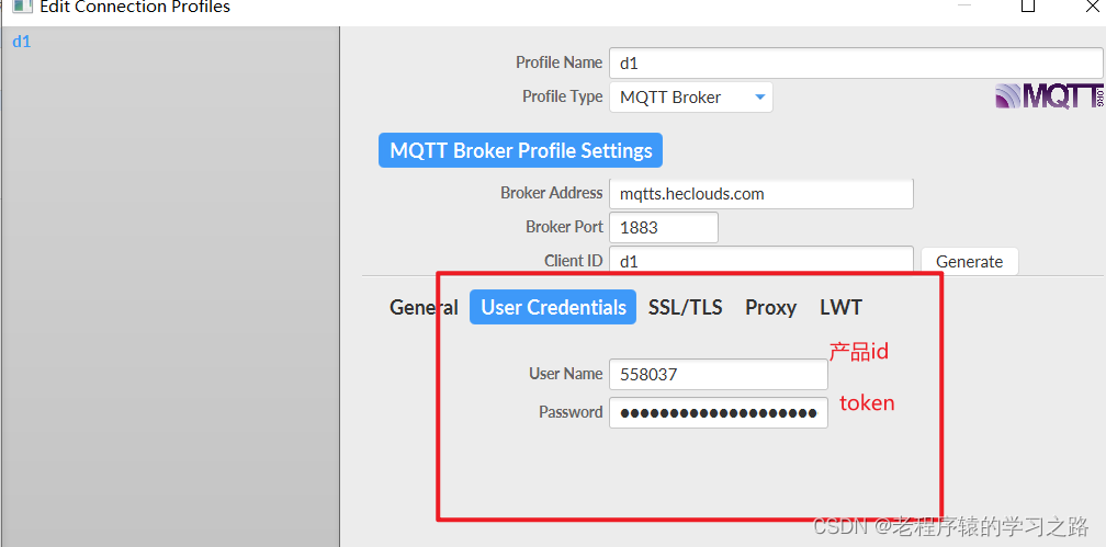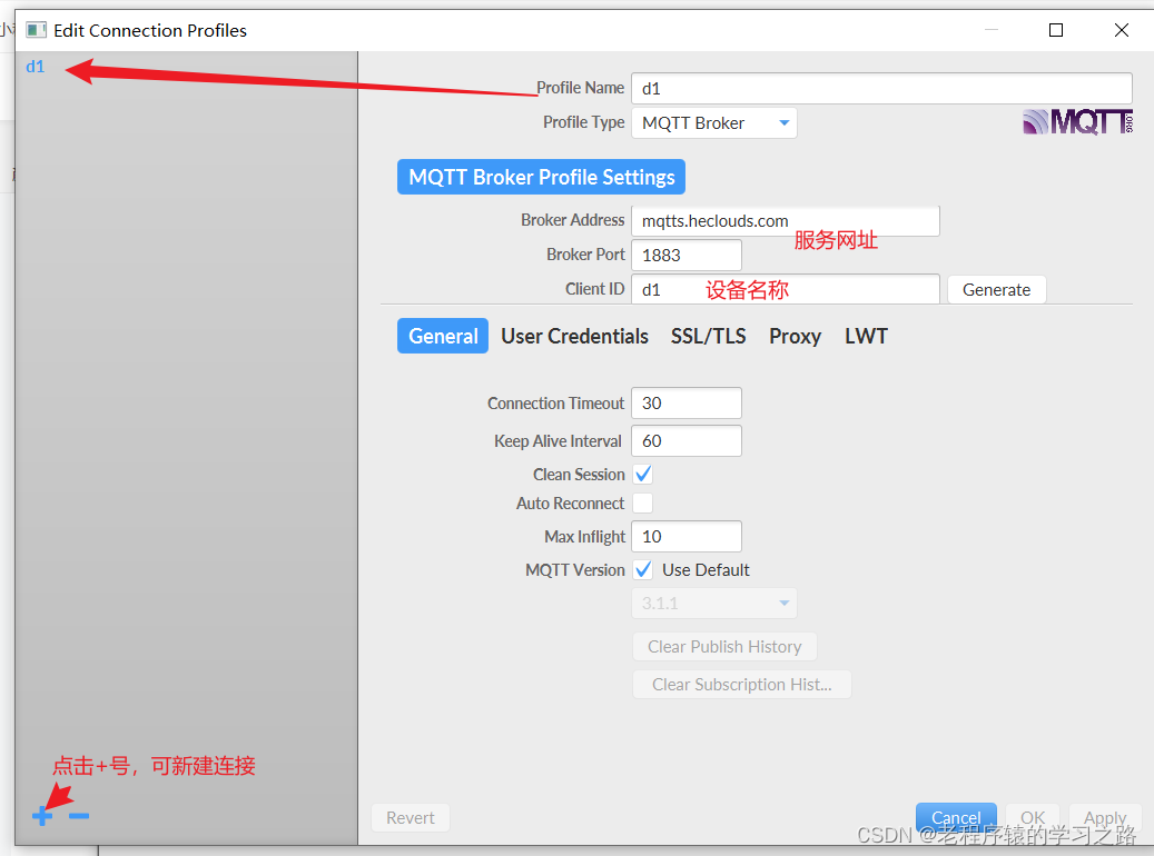 打开mqttfx,进行如下设置,(点击 【OneNET - 中国移动物联网开放平台】查看服务网址)