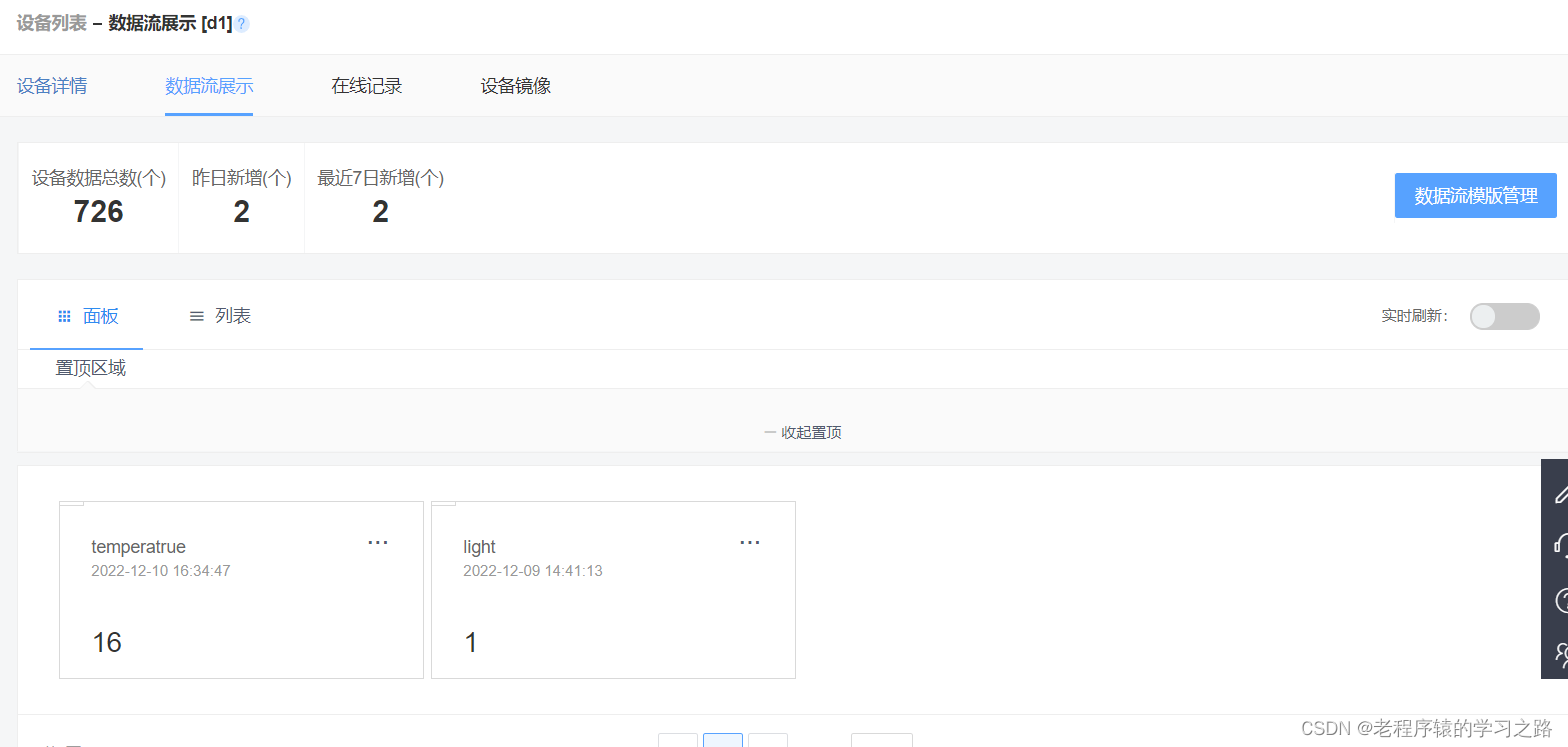 在设备d1的右侧,点击“数据流”—>点击“数据流模板管理”—>“添加数据流模板”,可以自定义添加数据流,这里我使用的是“temperatrue"数据流,esp8266开发板上的温度数据,会上传至此数据流模板。如不了解数据流概念,可查看官方文档OneNET - 中国移动物联网开放平台