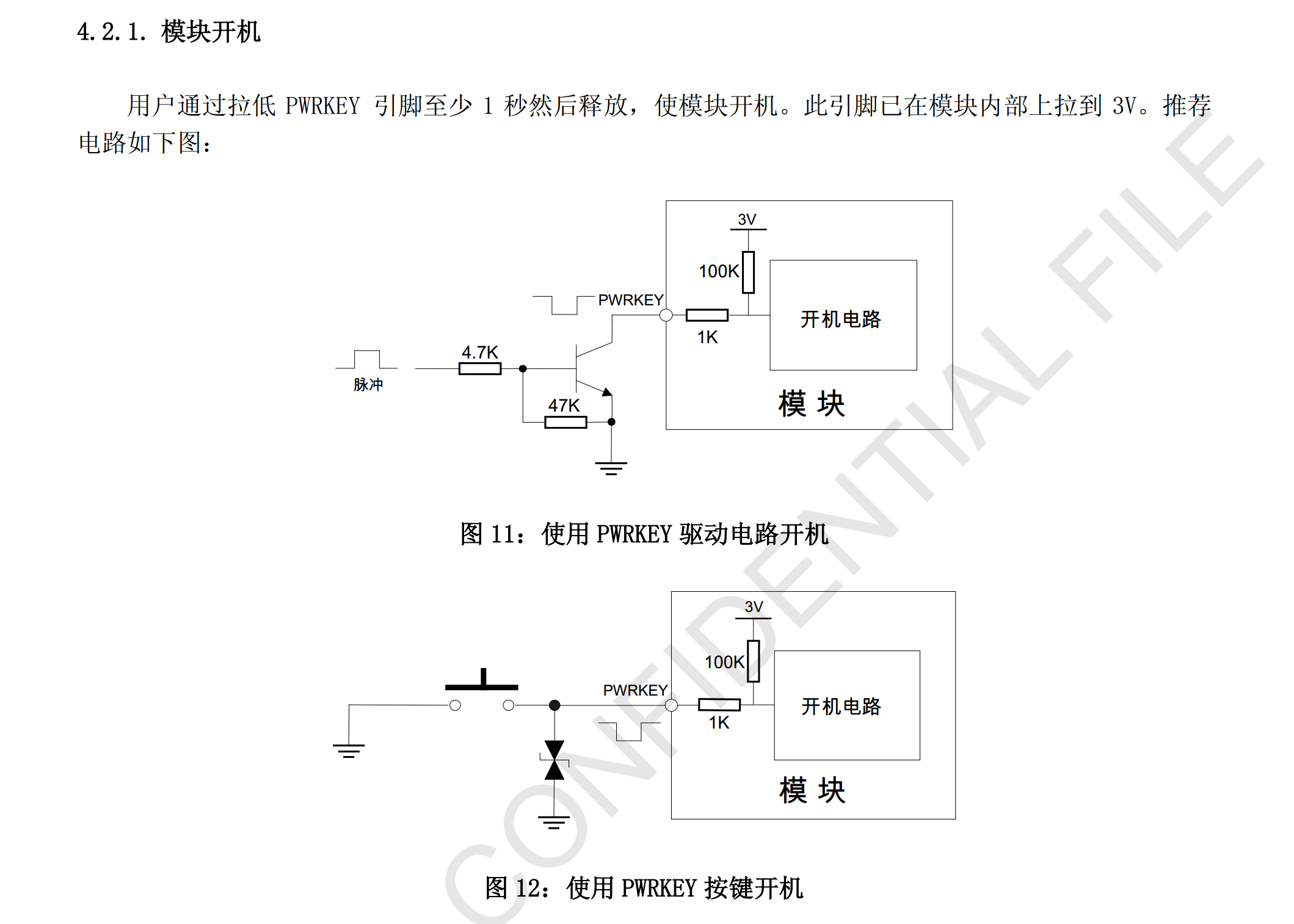 提示:模块内部有100K的上拉电阻,所以模组电源3.8V供电后,此引脚默认应该为高电平;模块开机方法是:通过拉低 PWRKEY 引脚至少 1 秒然后释放。