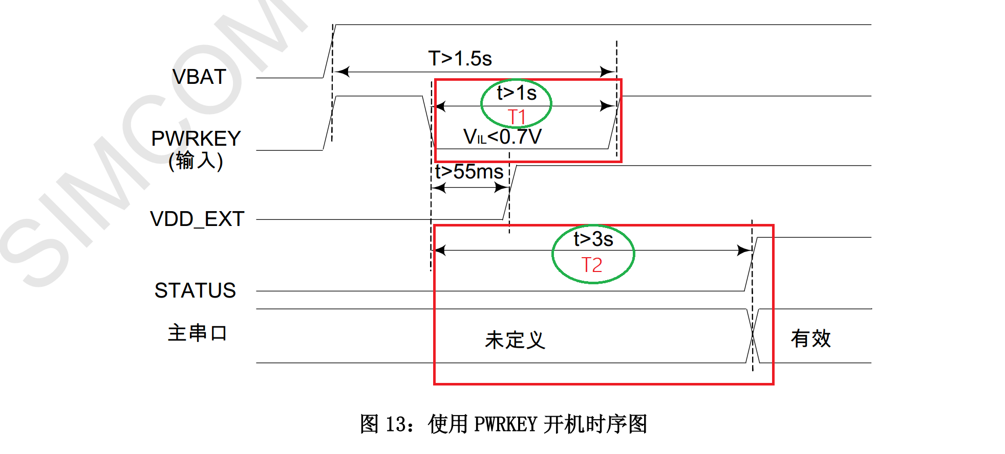 注意:1、模块正常供电(须满足DC3.8V/3A条件),开机PWRKEY引脚拉低的时间T1应该大于1秒,并且拉低的低电平应该小于0.7V,之后再释放PWRKEY引脚;