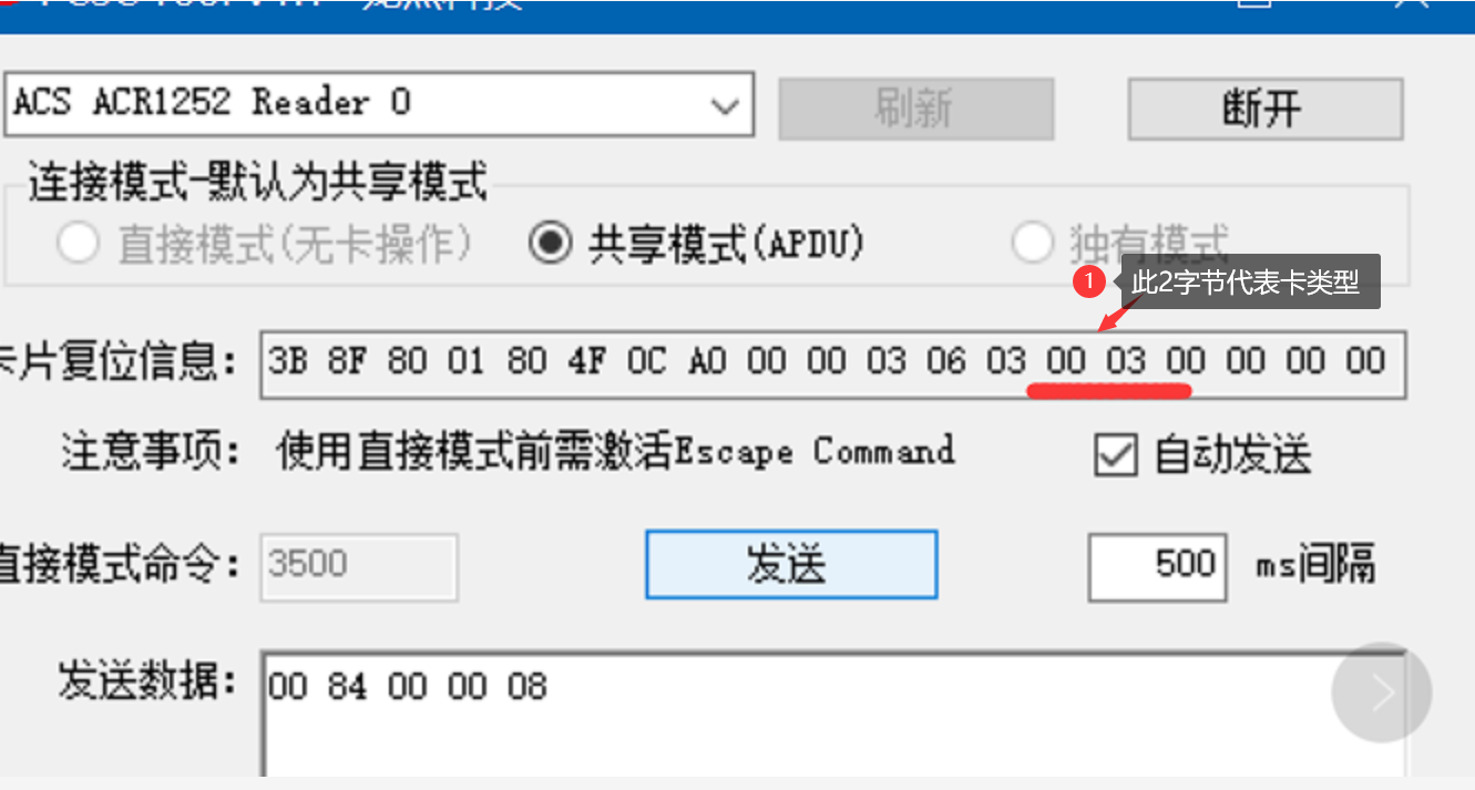 2、将卡片放在读卡器上面,然后选择“共享模式(APDU)”,然后点击“连接”按钮,此时读卡器将获取到卡片的复位信息,如图: