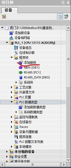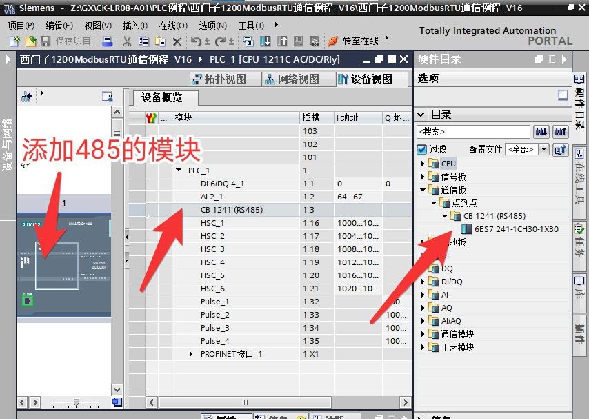 1、打开软件->创建工程->添加新设备(PLC)->设备和网络管理->点击PLC->看到硬件目录选择通信板->点到点->CB1241(RS485)->看到6ES7241-1CH30-1XB0选择添加,如图
