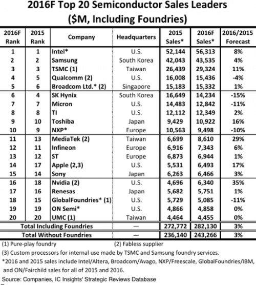 2016年上半年存储器的不景气对半导体市场影响颇大,而英伟达是二十大中增长最快的,IC Insights预计2016年销售额同比将增长35%。