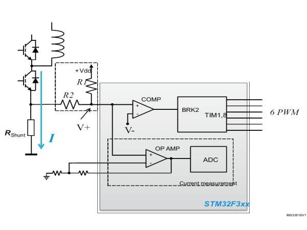 图1 显示了可以使用 STM32F302/303 的内部资源实现的电流检测和过流保护方案。由于电机相电流,分流电阻上的压降可以是正的也可以是负的,R1 和 R2 设置偏移。该信号链接到微控制器输入引脚,该引脚具有放大器和比较器非反相功能。