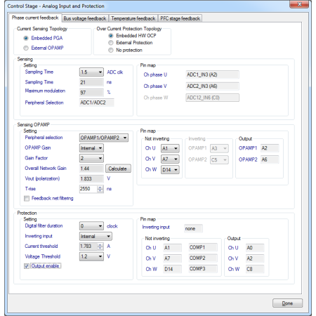 另一方面,可以设置电动机电流测量网络以使用外部运算放大器。在这种情况下,放大的信号直接馈送到 ADC 通道。在位于控制级的对话窗口 -> 模拟输入 -> 相电流反馈中,将“外部 OPAMP”设置为电流感应拓扑。