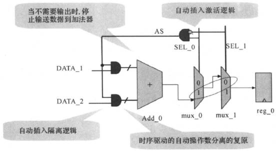 4. 操作数隔离如果在某一段时间内,数据通路的输出是无用的,则将它的输入置成个固定值,这样,数据通路部分没有翻转,功耗就会降低。