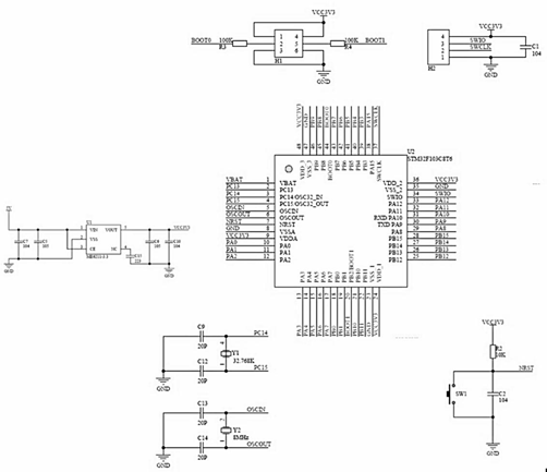STM32最小系统包括控制芯片、电源电路、晶振电路、复位电路、......如图3-1所示。