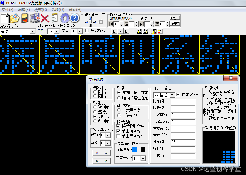 显示取模使用“PCToLCD2002”,取模设置如下图所示: