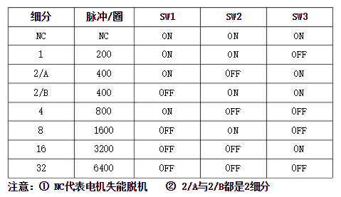 为了提高步进电动机控制的精度,现在的步进驱动器都有细分的功能,所谓细分,就是通过驱动器中电路的方法把步距角减小。比如把步进驱动器设置成5细分,假设原来步距角1.8°那么设成5细分后,步距角就是0.36°。也就是说原来一步可以走完的,设置成细分后需要走5步。一般步进电动机的细分表在驱动器上可以直接看到。(设置合适细分能够避免电机转动时震动过大,但过高的细分数会导致电机输出力矩减小)