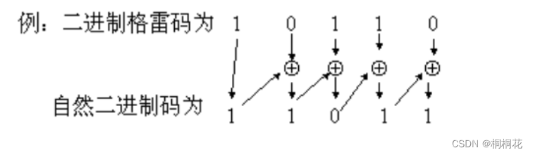 从最右边第一位开始,依次将每一位与左邻 一位异或(XOR),作为对应格雷码该位的值,最左边一位不变。