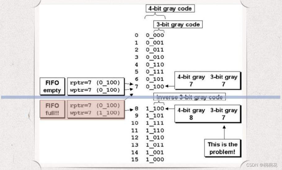 - wptr与rptr的次高位不相等(如上图位置 7和位置15,转化为二进制对应的是 0111和1111,MSB不同说明多折回一 次, 111相同代表同一位置。)