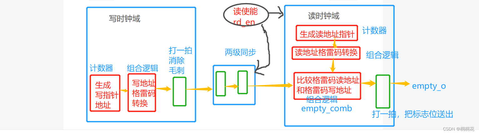 这个电路通过判断读时钟域下,写指针和读指针的关系,然后实时生成空信号rempty,以通知下游节点停止读操作。