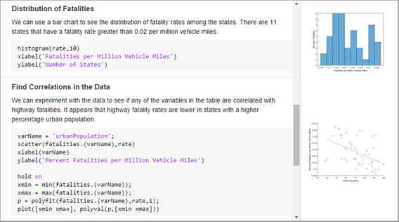 - 逐个运行代码段或作为整个文件运行,查看结果和图形以及生成它们的对应源代码。