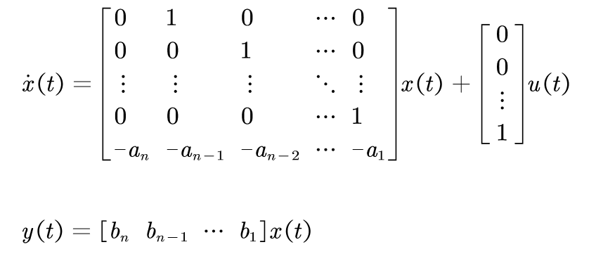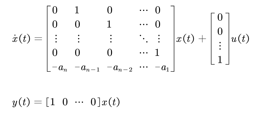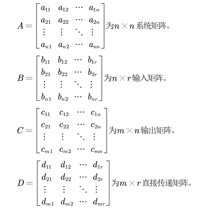 用向量-矩阵的形式表示时,状态空间方程如下: