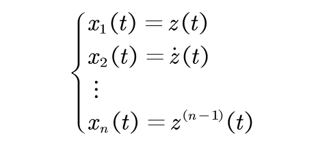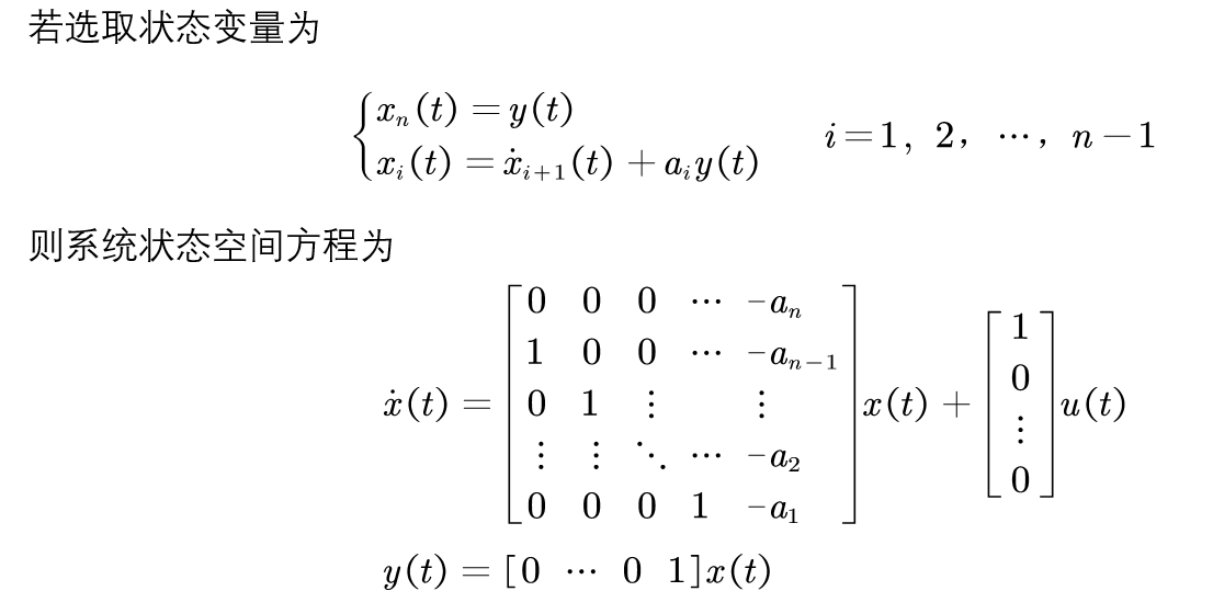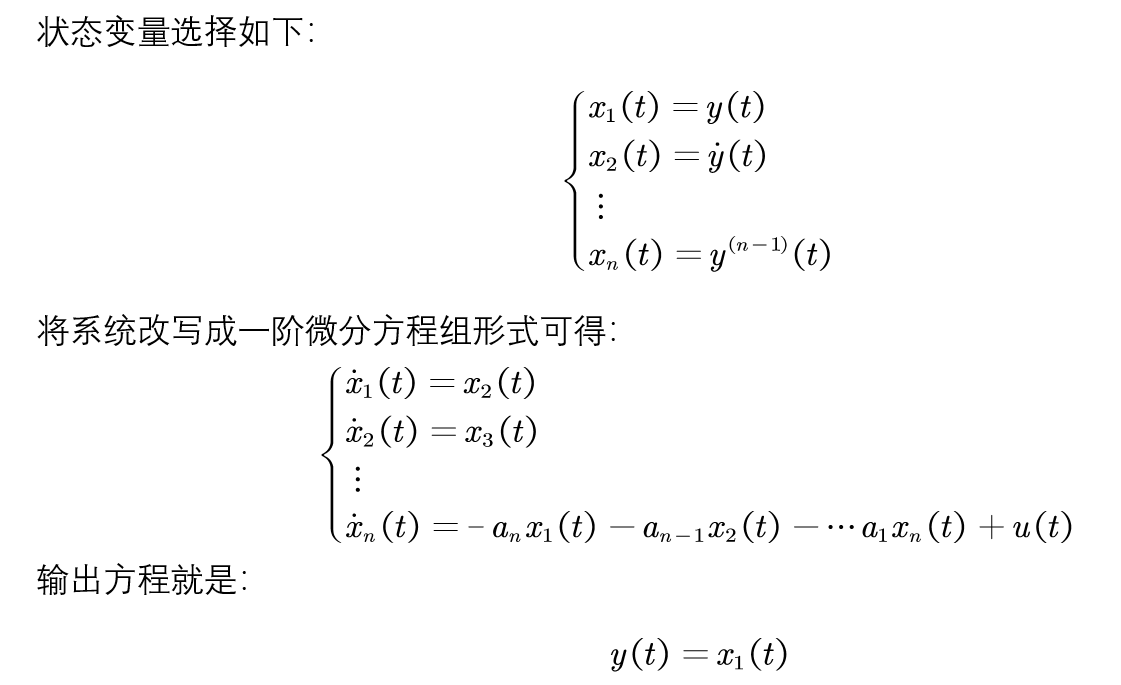 求解系统状态空间表达式的关键就在于状态变量的选取,对于如上输入不含导数项的情况,状态变量往往选为输出变量的0~n-1阶导数,就可以获得n个一阶微分方程,从而将高阶系统转化为一阶微分方程组,最终使控制系统得到简化。